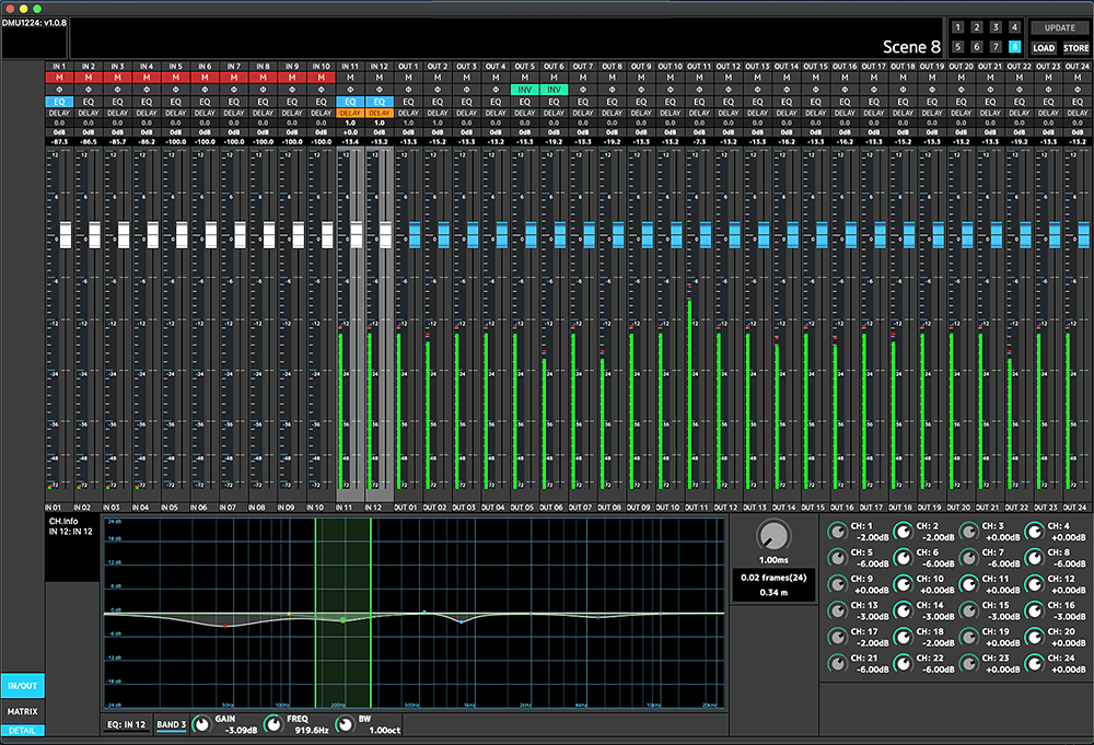 - フロントパネル操作で各chへのSENDやON/OFF、検聴、極性、PEQ、Delayを設定